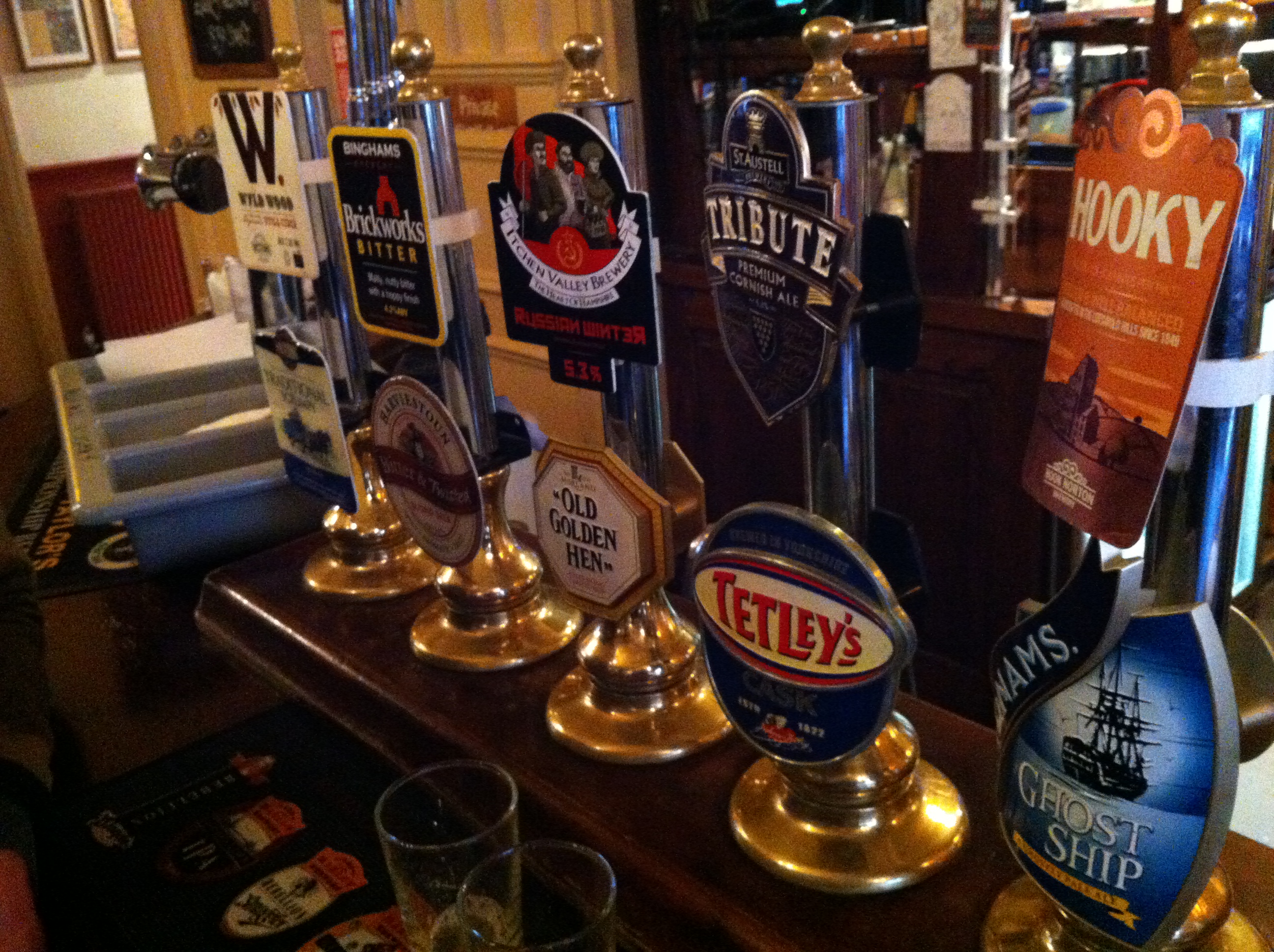 The inside of the bar is covered in original enamel tiles in blues and greens, perhaps not to every persons taste but it’s a nice to know that there’s a bit of authenticity about the place. My brother and I were promptly directed by a jolly bar wench (for sake of political correctness that by this I mean an ‘Alcoholic Beverage Dispensing Person’ and am in no way being derogatory) to a deeply impressive array of beers. The selection included some local brews, Tim Taylors and some more exotic tipples a pair of which set us back £6.70, a veritable bargain. The best bit here so far was that we were allowed to taste before we ordered and I was sober enough to not order the first thing I tried out of an oddly British compulsion not to inconvenience the bar staff.