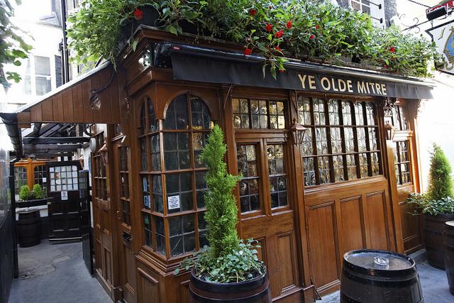 Ye Olde Mitre also seemed to be refusing to look like a modern pub. Old branded whiskey jugs hang from the ceiling like mad ceramic coconuts, the carpet appears to have been stolen from the Rovers Return circa 1976 and almost everything in sight is made out of well aged wood. After glugging back half a pint you can easily forget that you’re in one of the worlds most ludicrously busy cities and are in fact now in a quiet country pub; maybe relaxing after misdirecting a Land Rover full of yuppies into a reservoir or murdering some foxes/badgers.